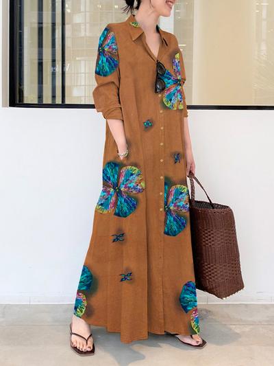 Women Long Sleeve Button-down Pattern Print Long Shirt Dres
