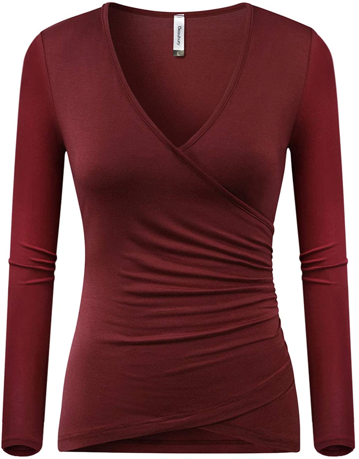 V Neck Slim Fitted T-Shirt Front Surplice Wrap Short/Long Sleeve Tees